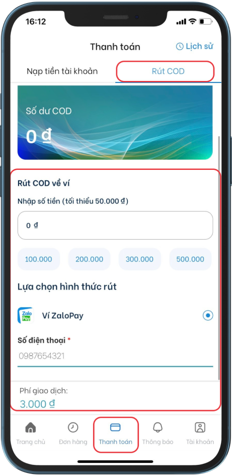 - Phí rút tiền về Ví ZaloPay là 3.000VNĐ/ giao dịch. Đối tác Nhà hàng chỉ có thể thao tác rút tiền từ tài khoản số dư COD về ví ZaloPay trong khung giờ 22h – 9h.